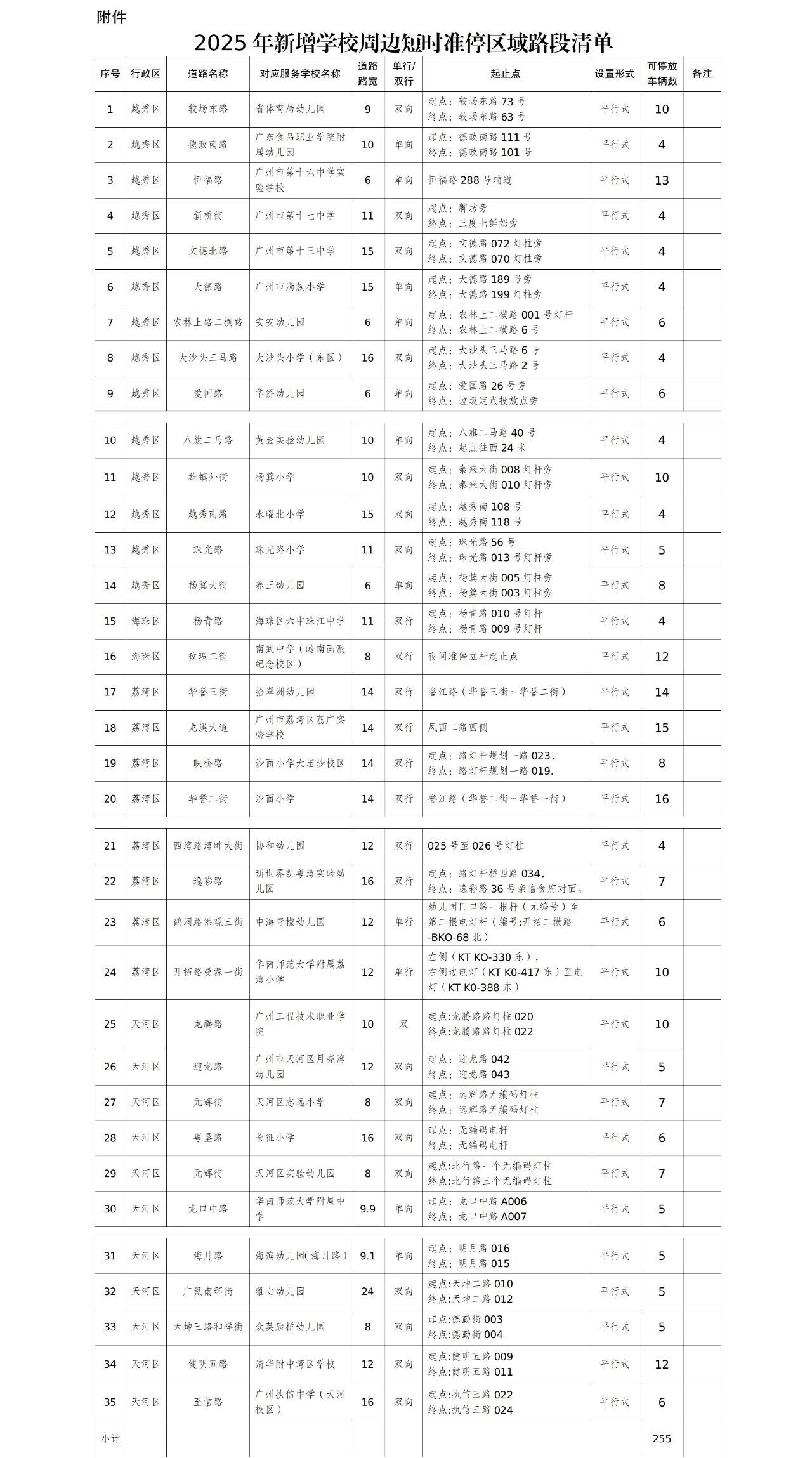 据广州泊车音尘,为缓解学校左近家长接送学生时车辆泊车需求,凭证《广州市泊车场条例》相干端正,经会同市公安交管部门、相干区东说念主民政府持续,广州市交通运输局自2025年10月22日起,增设35条短时准停区域路段城市说念路临时泊位成就诡计(详见附件),可临泊车辆约255辆,允许停放时段为7:40—8:10及16:00—18:00。